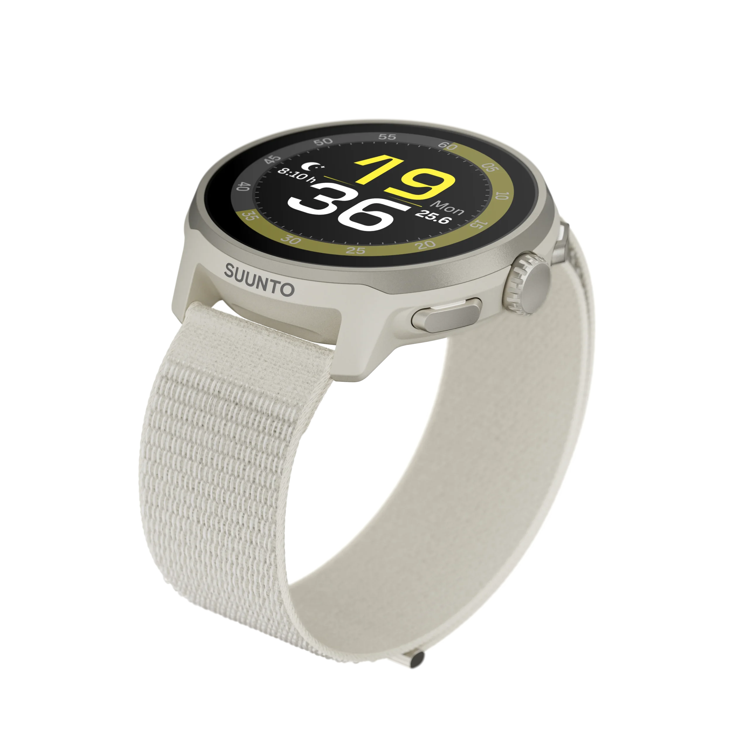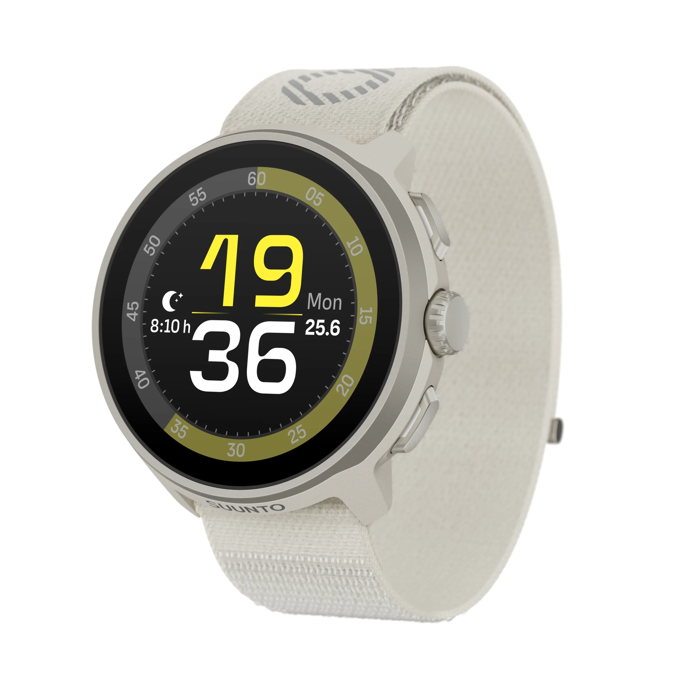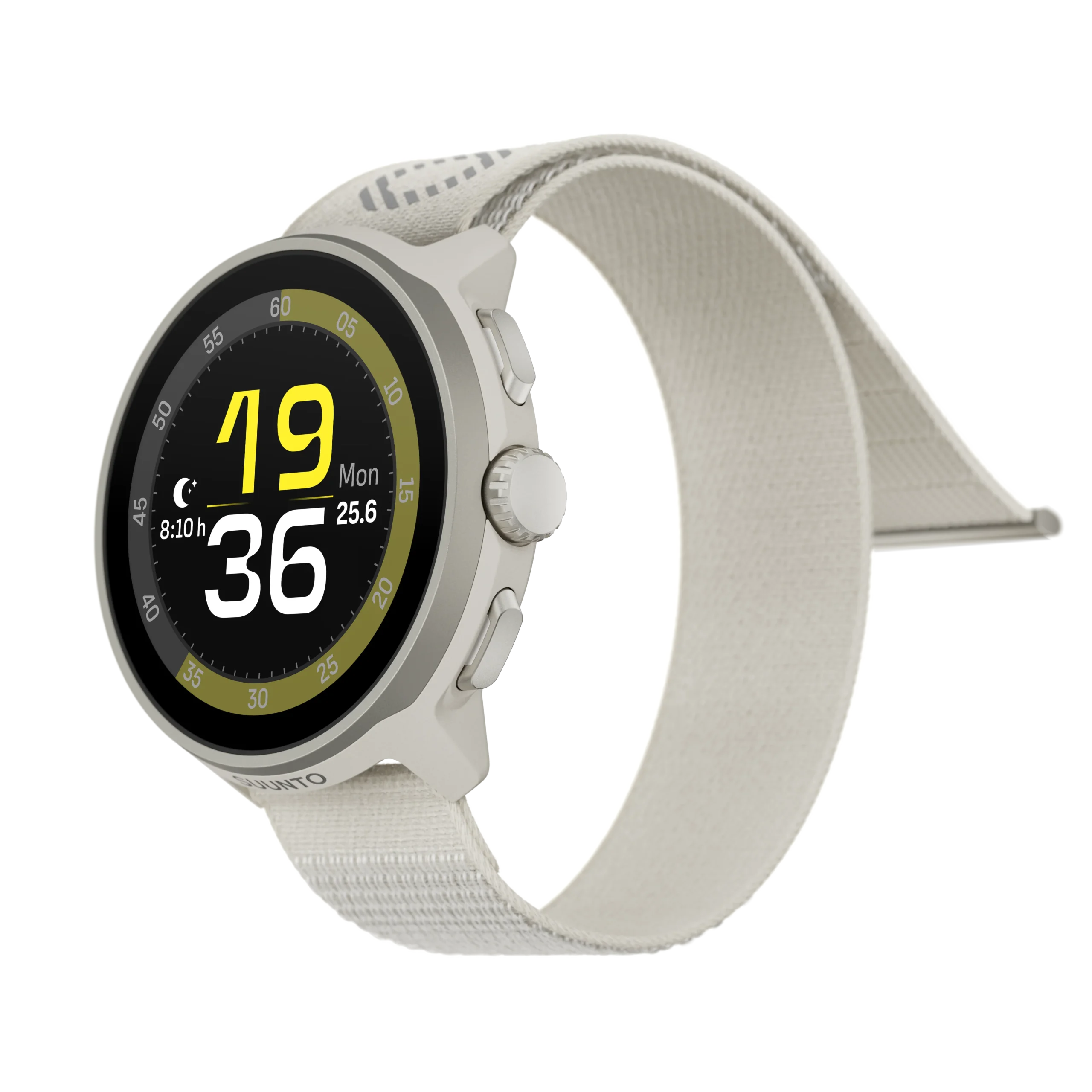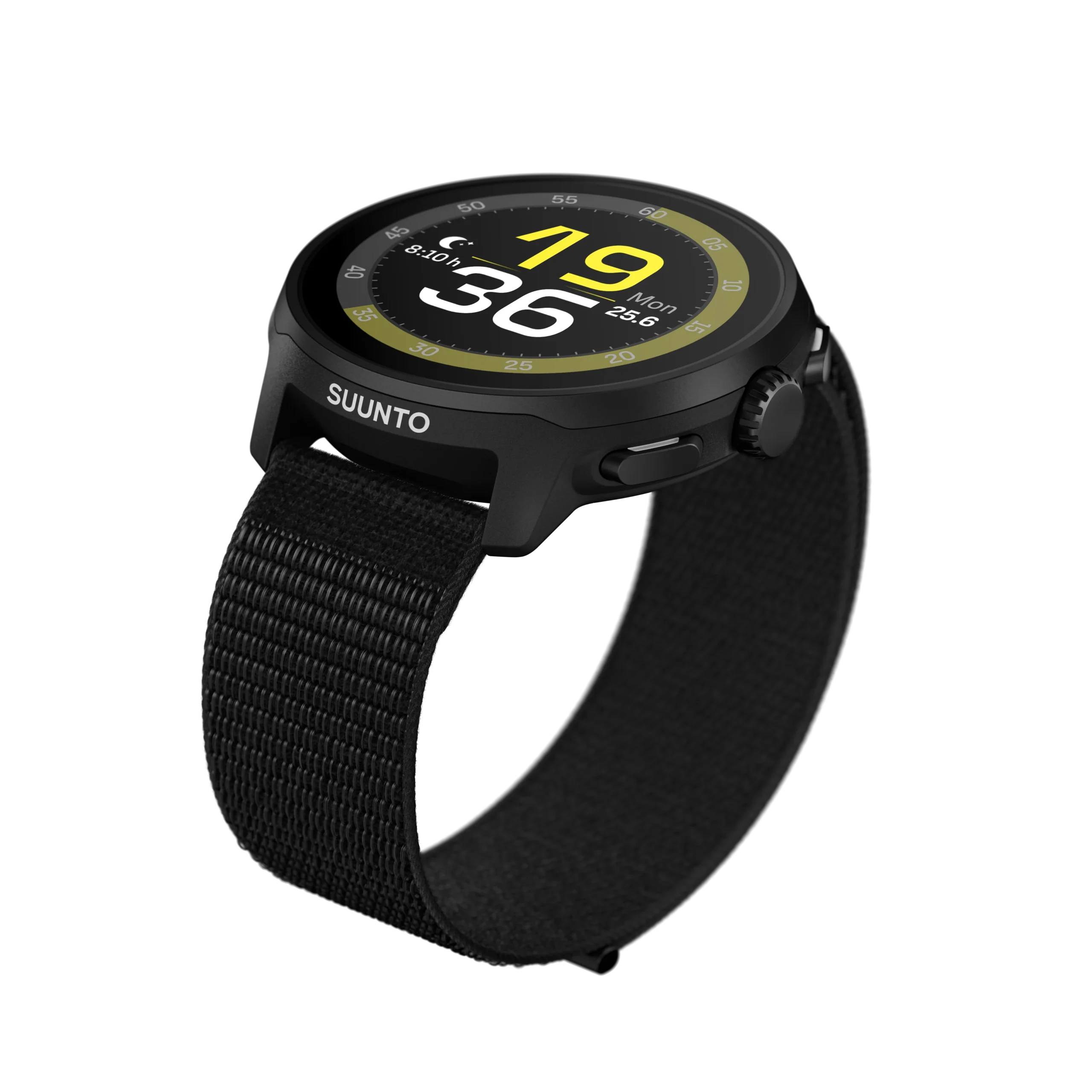 Στεφάνη από ανοξείδωτο ατσάλι με κάσα σε χρώμα ανάλογα με το λουράκι και υφασμάτινο λουράκι με ανακλαστικό λογότυπο SUUNTO.